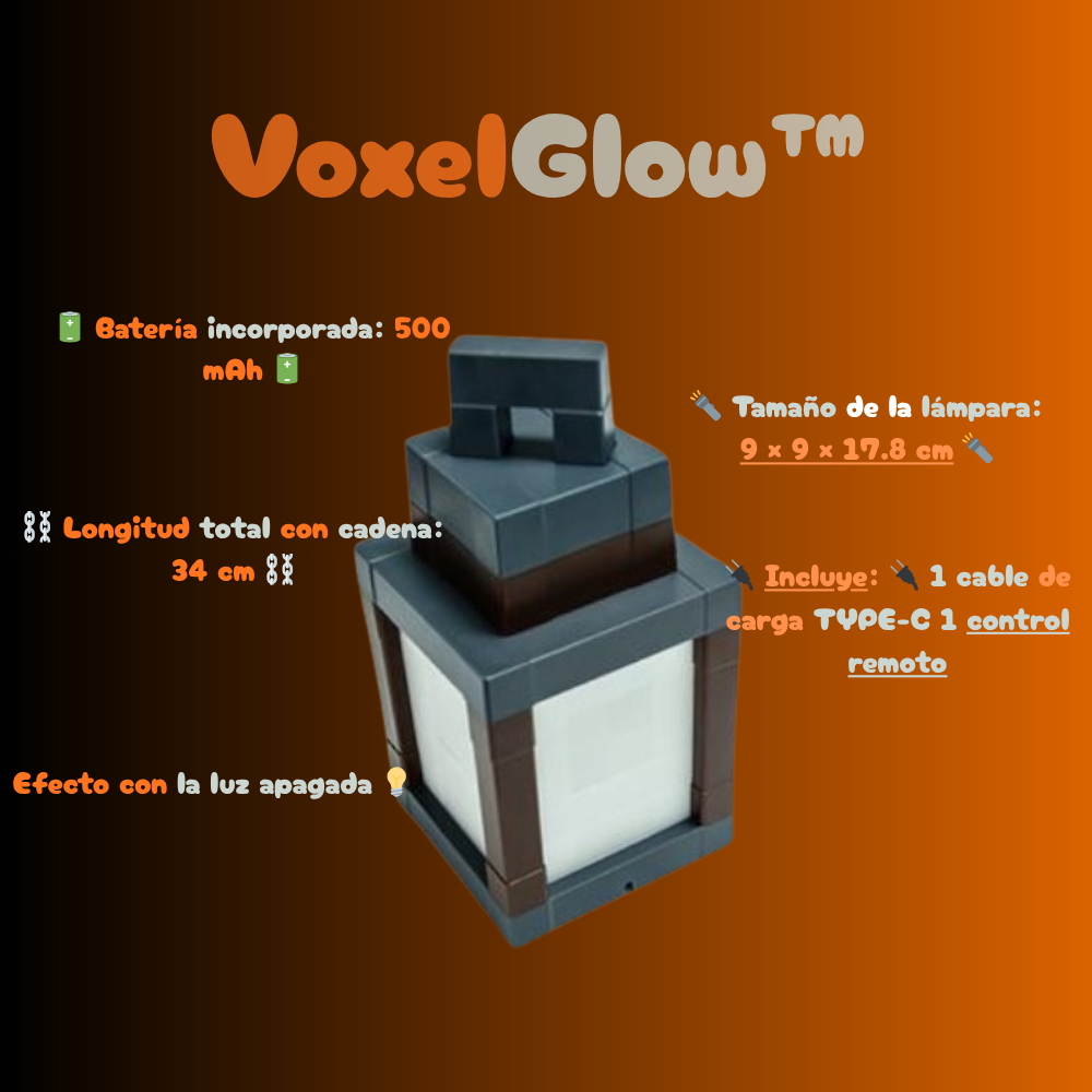 Lleva el estilo gamer a tu espacio con VoxelGlow™, la lámpara pixel RGB inspirada en el universo de bloques. Con 16 colores y 4 modos de iluminación, crea el ambiente perfecto para tu setup, habitación o zona de descanso. Su batería recargable de 500 mAh te permite usarla sin cables, y con el control remoto puedes cambiar el color, brillo y efecto con un solo clic.